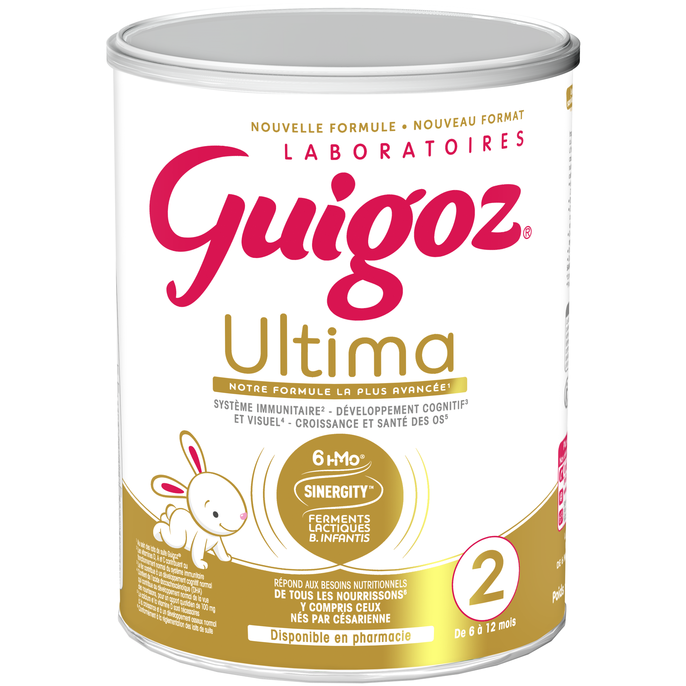 | Caractéristiques | Pour subvenir aux besoins nutritionnels de tous les nourrissons y compris ceux à risque de dysbiose (anciens prématurés, naissance par césarienne, antibiothérapie, antécédents familiaux d'allergie). Guigoz Ultima 2 contient : -6 des principaux HMO représentant 56% des HMO du lait maternel et couvrant les 3 familles. Bénéfices sur la modulation du microbiote, la protection contre les infections et la modulation du système immunitaire. -Probiotique B. infantis, métabolisant le plus efficacement les HMO et avec des bénéfices cliniquement démontrés sur la modulation de l'environnement intestinal. -> 6 HMO et B. infantis agissent en synergie et forment un synbiotique synergique pour renforcer leurs bénéfices sur le microbiote intestinal et le système immunitaire -Probiotique B. lactis efficacité prouvée et bénéfices pour le système immunitaire des nourrissons -100% PSPH (Protéines solubles partiellement hydrolysées) pour une bonne digestibilité" |