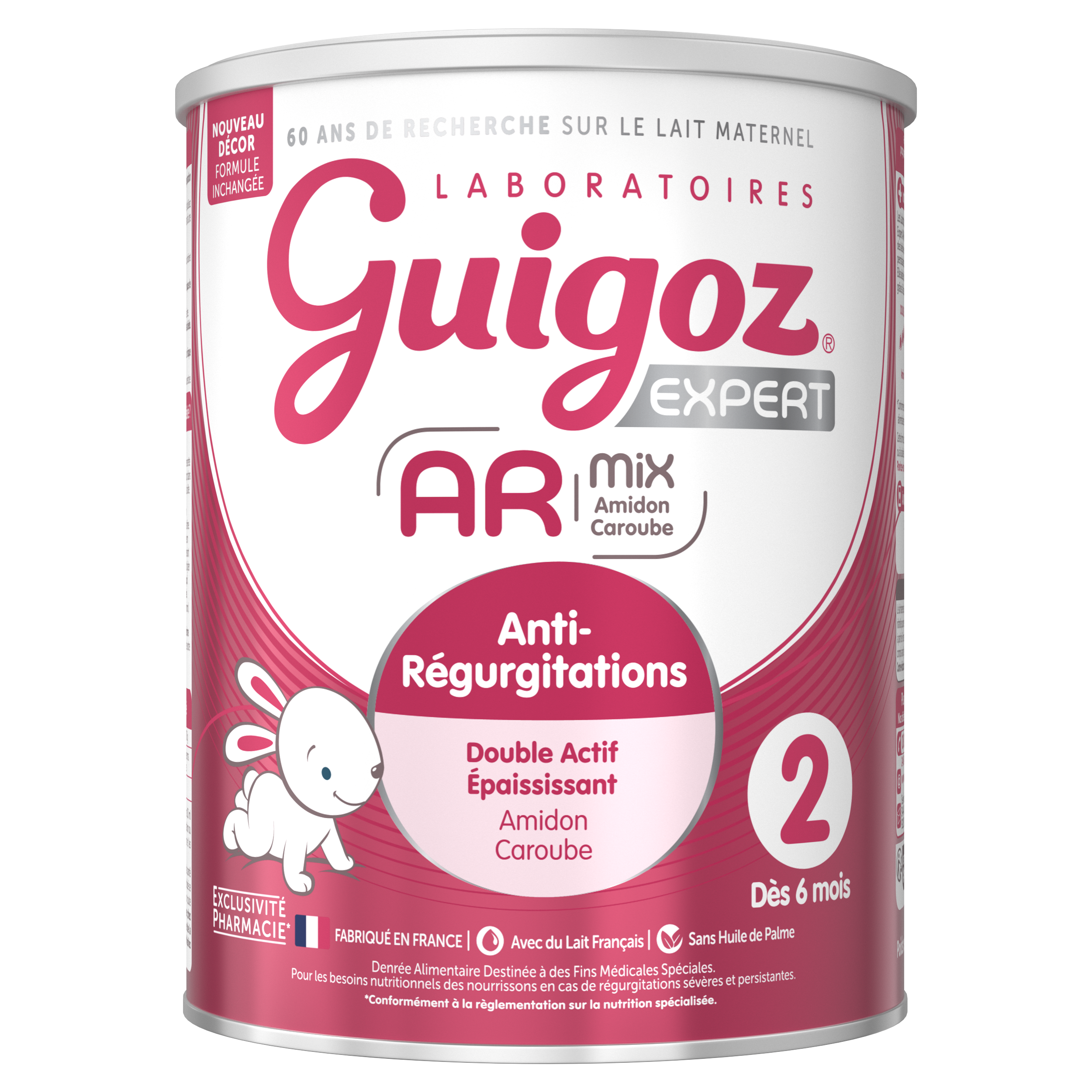 | Caractéristiques | Guigoz Expert AR mix 2 contient : -Un double épaississant avec un mix de farine de graines de caroube et d'amidon. Ces ingrédients complémentaires entrainent un épaississement du bol alimentaire, ce qui réduit éfficacement les régurgitations (1) -Une prédominance de protéines solubles (Cas/ Ps = 30/70) pour accélérer la vidange gastrique (2) -Des protéines selon le procédé Optipro : en quantité et qualité proches du lait maternel pour une croissance harmonieuse -Et un rapport DHA/ARA avec un rapport 1/1 selon les recommandations de l’EFSA pour contribuer au développement cérébral |